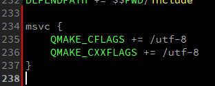 如果MSVC编译时,或者在pro文件最下面加入:properties1234msvc { QMAKE_CFLAGS += /utf-8 QMAKE_CXXFLAGS += /utf-8}然后“重新构建”(一定要进行这步)即可